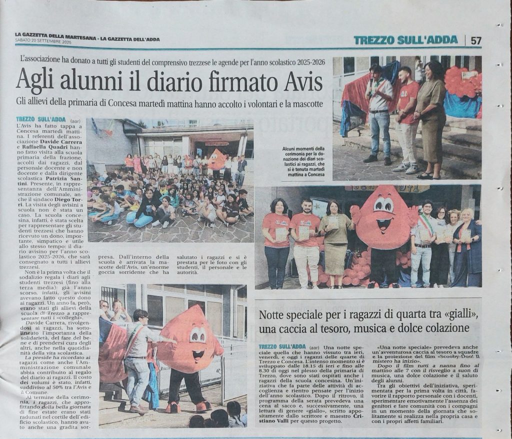 Lo scorso 20 settembre compare sul quotidiano “La Gazzetta dell’Adda” un articolo che ci vede protagonisti. Presso la scuola primaria di Concesa, dove si è tenuta la cerimonia di presentazione e consegna delle agende scolastiche, Avis Trezzo ha distribuito mille diari scolastici ripartiti tra gli studenti delle scuole dell’infanzia, primaria e secondaria di Trezzo sull’Adda […]